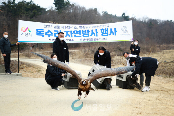 (서울일보/정진석 기자) 농약중독으로 쓰러진 천연기념물이자 멸종위기야생생물 II급인 독수리 3마리가 충남 서산시 천수만 하늘로 돌아갔다.시는 지난 11일 김인수 경제환경국장과 김병수 충남